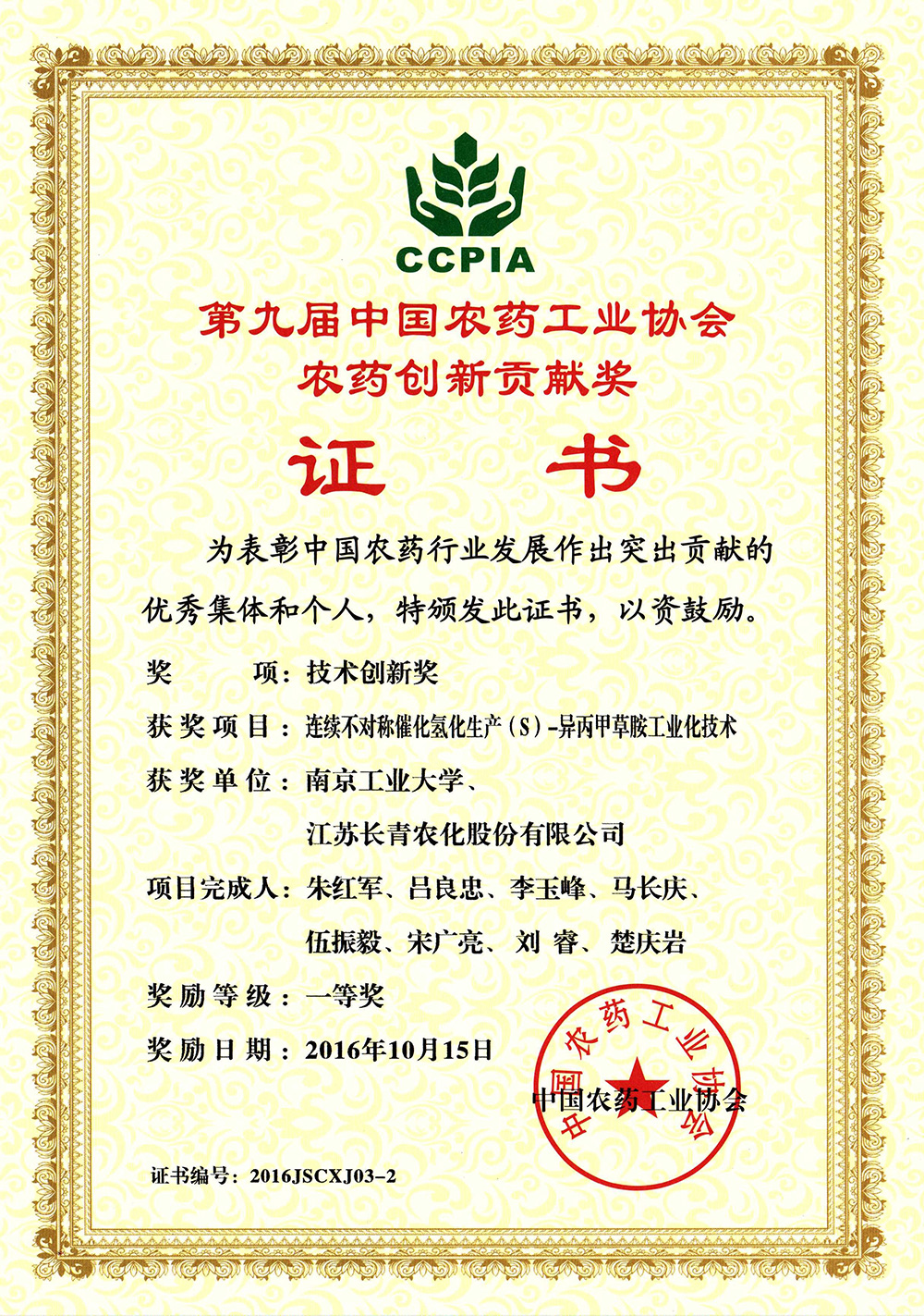 2018中國石油和化學工業科學技術獎勵--證書--長青南通