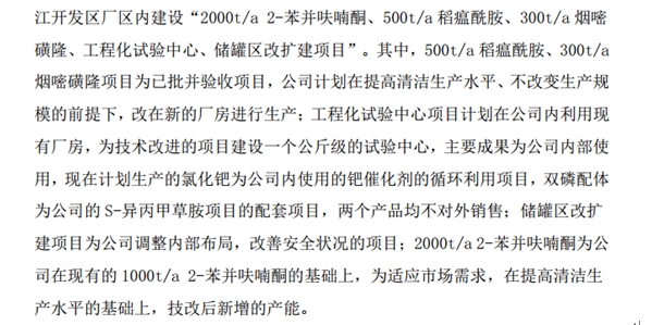近日,公司擬投資17770萬元的2000t/a 2-苯并呋喃酮、500t/a稻瘟酰胺、300t/a煙嘧磺隆、工程化試驗中心、儲罐區改擴建項目已順利立項,經過專家評審,目前進入環評審批階段。