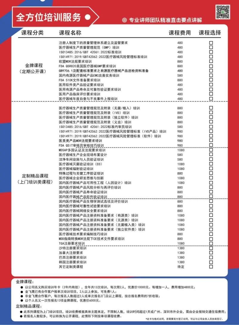 培訓(xùn)分為定期線下公開課上門培訓(xùn)兩種形式,共有13節(jié)金牌課程+34節(jié)定制精品課程(詳見下方海報,課程主題涵蓋了醫(yī)療器械國內(nèi)外注冊及體系的多個環(huán)節(jié)、多個領(lǐng)域,優(yōu)選金飛鷹具備豐富專業(yè)知識及實戰(zhàn)經(jīng)驗的技術(shù)及項目老師,為學(xué)員提供全方位、高質(zhì)量的醫(yī)療器械注冊指導(dǎo)。感興趣的可掃描下方二維碼報名哦~