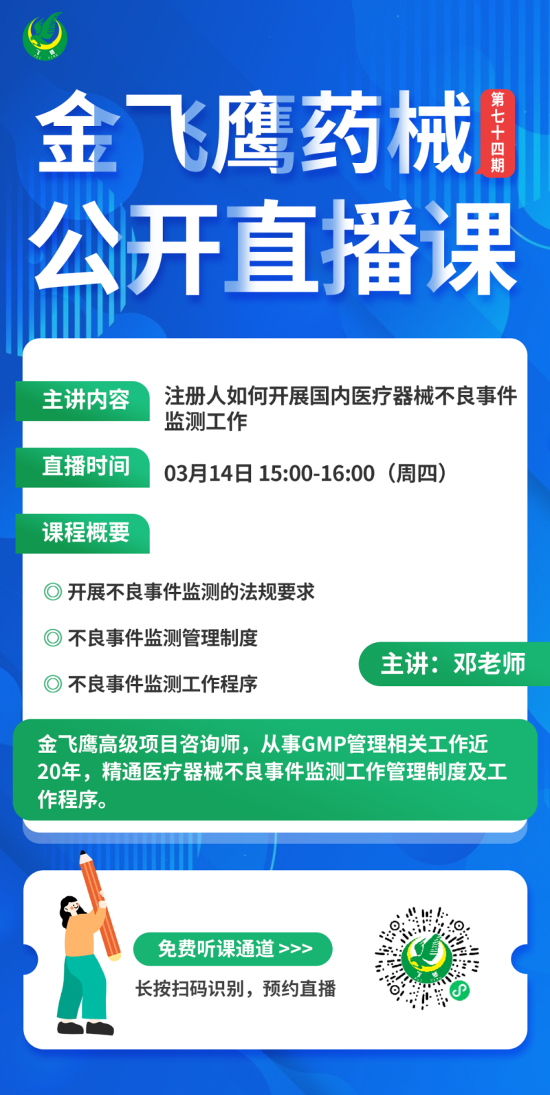 3月14日下午3點,金飛鷹高級項目咨詢師,從事GMP管理相關(guān)工作近20年,精通醫(yī)療器械不良事件監(jiān)測工作管理制度及工作程序的鄧老師,給大家?guī)怼蹲匀巳绾伍_展國內(nèi)醫(yī)療器械不良事件監(jiān)測工作》,培訓內(nèi)容包括醫(yī)療器械不良事件監(jiān)測管理制度、工作程序等,感興趣的企業(yè)千萬不要錯過了哦!