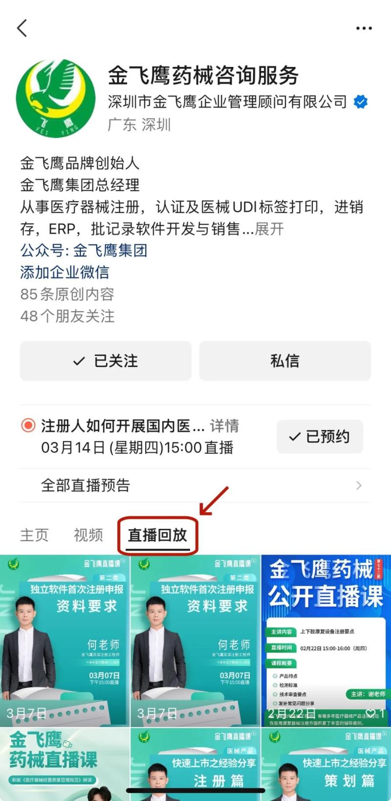 劃重點!往期直播培訓課程支持回放,關(guān)注“金飛鷹藥械咨詢服務”視頻號并點擊視頻號主頁,即可查看“直播回放”哦~