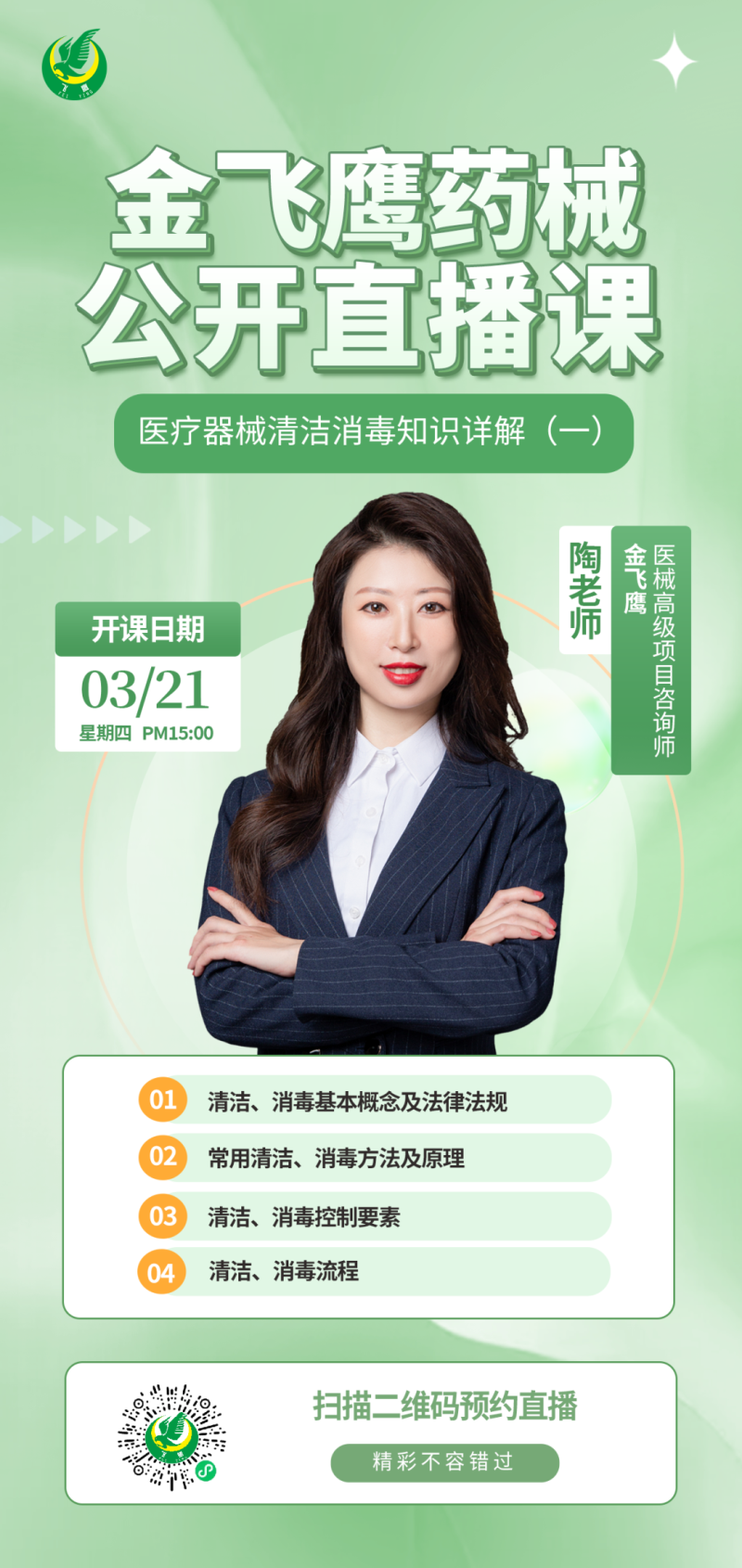 3月21日下午3點(diǎn),金飛鷹高級(jí)項(xiàng)目咨詢師,負(fù)責(zé)過多種無(wú)菌和植入耗材類醫(yī)療器械產(chǎn)品國(guó)外委托生產(chǎn)&國(guó)內(nèi)技術(shù)轉(zhuǎn)移項(xiàng)目,對(duì)醫(yī)療器械消毒滅菌頗有研究的陶老師,給大家?guī)?lái)《醫(yī)療器械清潔消毒知識(shí)詳解(一)》,培訓(xùn)內(nèi)容包括清潔/消毒基本概念及法律法規(guī)、常用清潔/消毒方法及原理、清潔/消毒控制要素、清潔/消毒流程等,因涉及到的內(nèi)容較多,這一主題將分為兩期內(nèi)容來(lái)講,大家記得要持續(xù)關(guān)注哦!