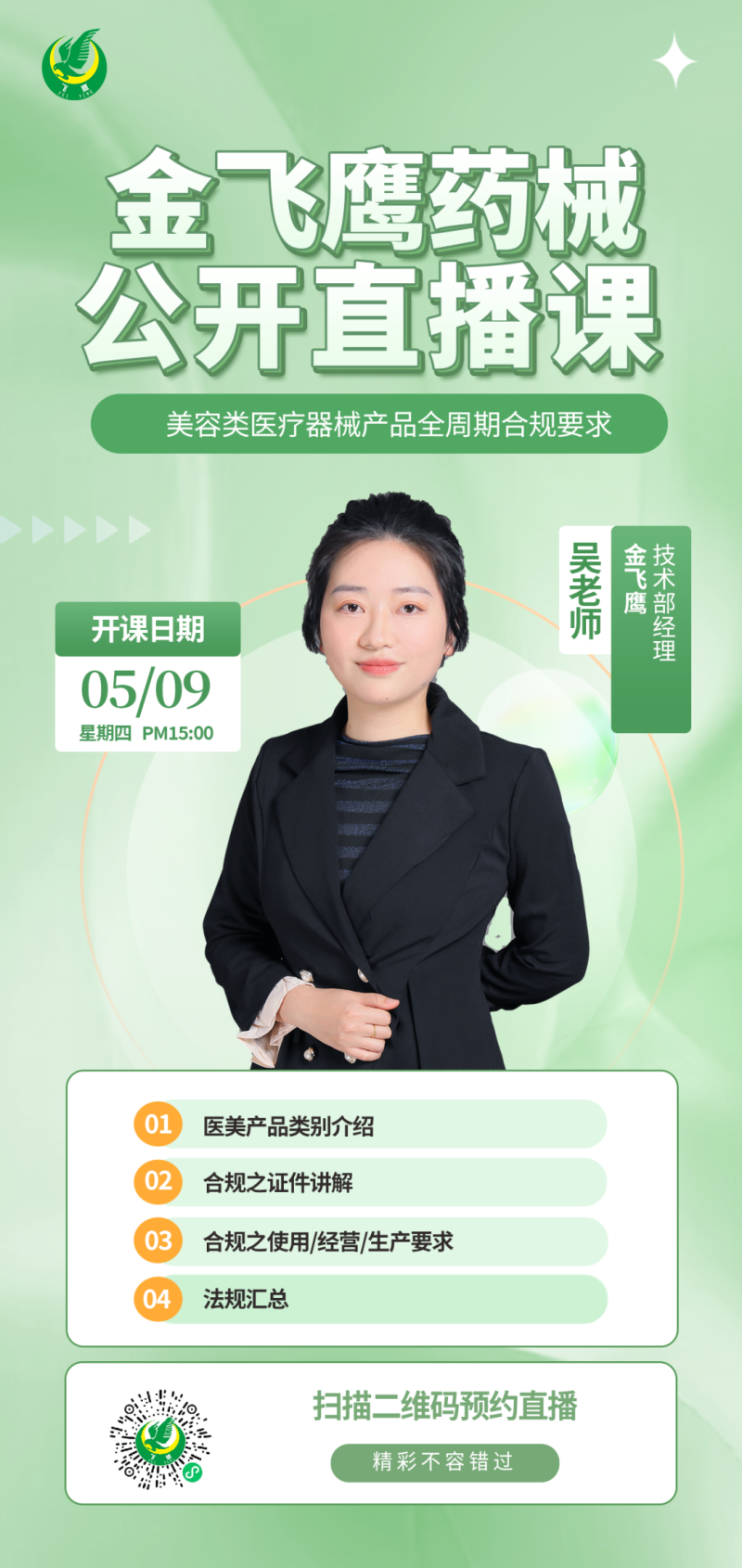 金飛鷹直播培訓(xùn),是每周一次的固定培訓(xùn)欄目,優(yōu)選金飛鷹國內(nèi)外資深注冊/項目老師定期為大家講解醫(yī)療器械注冊相關(guān)知識,解答大家在醫(yī)療器械注冊過程中的諸多疑問。