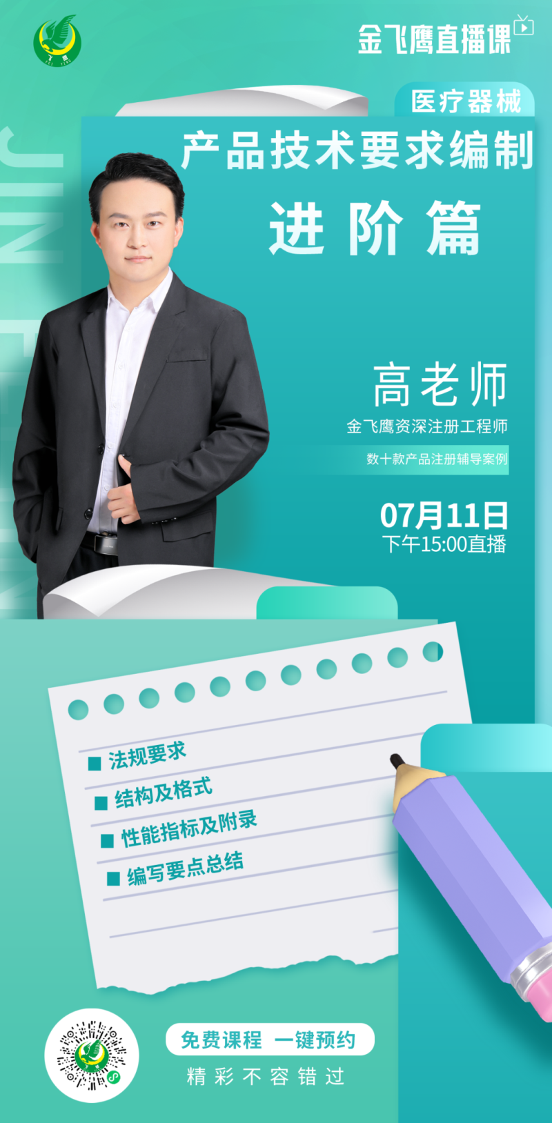 7月11日下午3點,金飛鷹資深注冊工程師,擁有多年醫(yī)療器械行業(yè)經(jīng)驗,成功輔導(dǎo)數(shù)十款產(chǎn)品合規(guī)上市的高老師,給大家?guī)怼夺t(yī)療器械產(chǎn)品技術(shù)要求編制-進(jìn)階篇》,培訓(xùn)內(nèi)容包括法規(guī)要求、結(jié)構(gòu)及格式、性能指標(biāo)及附錄、編寫要點總結(jié),大家千萬不要錯過了哦!