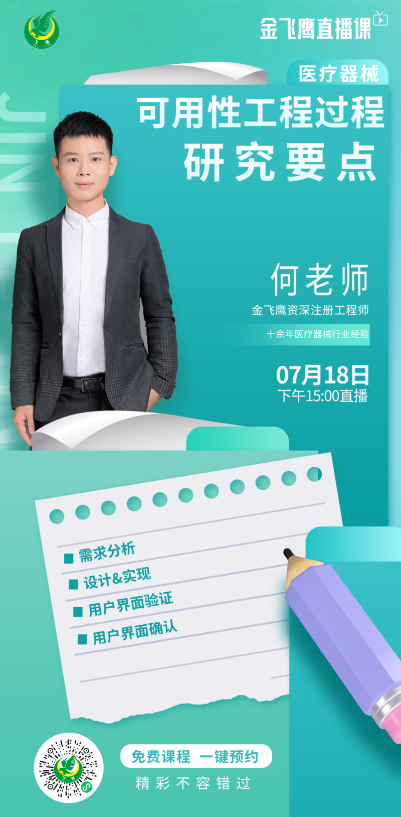 7月18日下午3點(diǎn),金飛鷹資深注冊(cè)工程師,擁有十余年醫(yī)療器械行業(yè)經(jīng)驗(yàn),對(duì)可用性工程頗有研究的何老師,繼續(xù)給大家?guī)怼夺t(yī)療器械可用性工程過程研究要點(diǎn)培訓(xùn)內(nèi)容包括需求分析、設(shè)計(jì)&實(shí)現(xiàn)、用戶界面驗(yàn)證、用戶界面確認(rèn),大家千萬不要錯(cuò)過了哦!