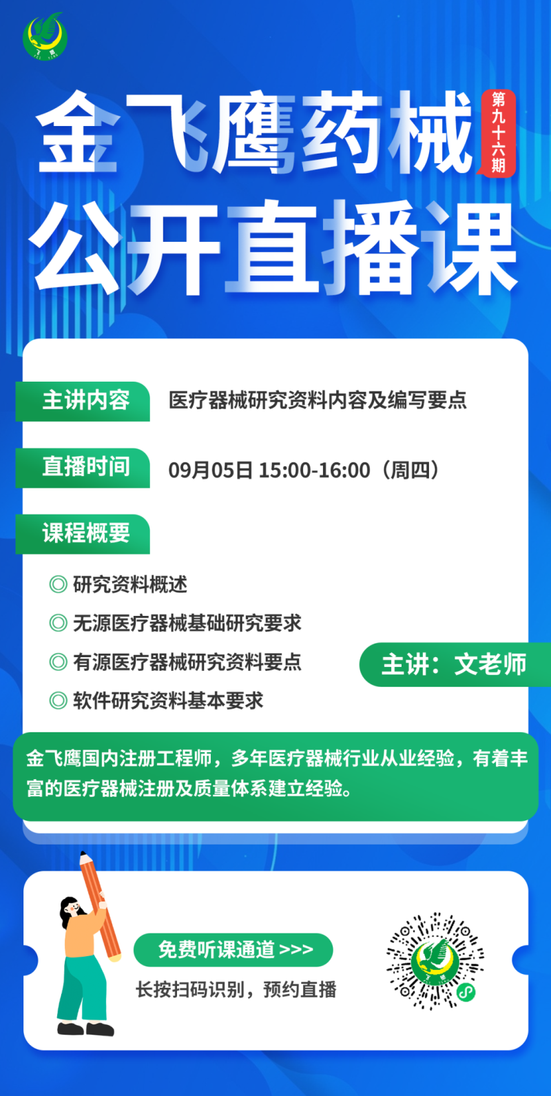 金飛鷹直播培訓(xùn),是每周一次的固定培訓(xùn)欄目,優(yōu)選金飛鷹國(guó)內(nèi)外資深注冊(cè)/項(xiàng)目老師定期為大家講解醫(yī)療器械注冊(cè)相關(guān)知識(shí),解答大家在醫(yī)療器械注冊(cè)過(guò)程中的諸多疑問。