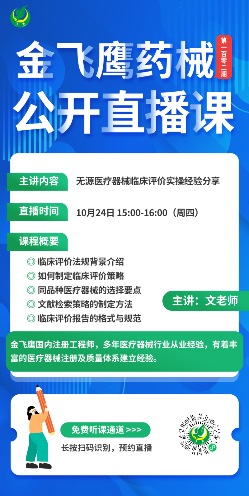 金飛鷹直播培訓(xùn),是每周一次的固定培訓(xùn)欄目,優(yōu)選金飛鷹國內(nèi)外資深注冊/項目老師定期為大家講解醫(yī)療器械注冊相關(guān)知識,解答大家在醫(yī)療器械注冊過程中的諸多疑問。
