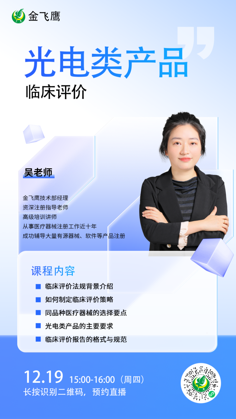 根據(jù)金飛鷹近18年的醫(yī)療器械注冊輔導(dǎo)經(jīng)驗總結(jié),臨床評價資料一直是讓企業(yè)最為頭疼的項目,資料的不完善會直接導(dǎo)致注冊周期的延長。經(jīng)常關(guān)注我們的朋友也許還記得,此前我們跟大家分享過幾期有關(guān)醫(yī)療器械臨床評價的內(nèi)容(點擊視頻號主頁可觀看回放),那么本期培訓(xùn),我們在帶大家一起回顧臨床評價基礎(chǔ)知識的同時,主要偏向于光電類產(chǎn)品的臨床評價,結(jié)合我們輔導(dǎo)過的光電類產(chǎn)品案例進行講解,從而給此類企業(yè)臨床評價提供更多實用參考。12月19日下午3點,金飛鷹技術(shù)部經(jīng)理、從事醫(yī)療器械注冊工作近十年的吳老師給大家?guī)怼豆怆婎惍a(chǎn)品臨床評價》,培訓(xùn)內(nèi)容包括臨床評價法規(guī)背景介紹、如何制定臨床評價策略、同品種醫(yī)療器械的選擇要點、光電類產(chǎn)品的臨床評價要求、臨床評價報告的格式與規(guī)范,想聽課的朋友記得提前預(yù)約!