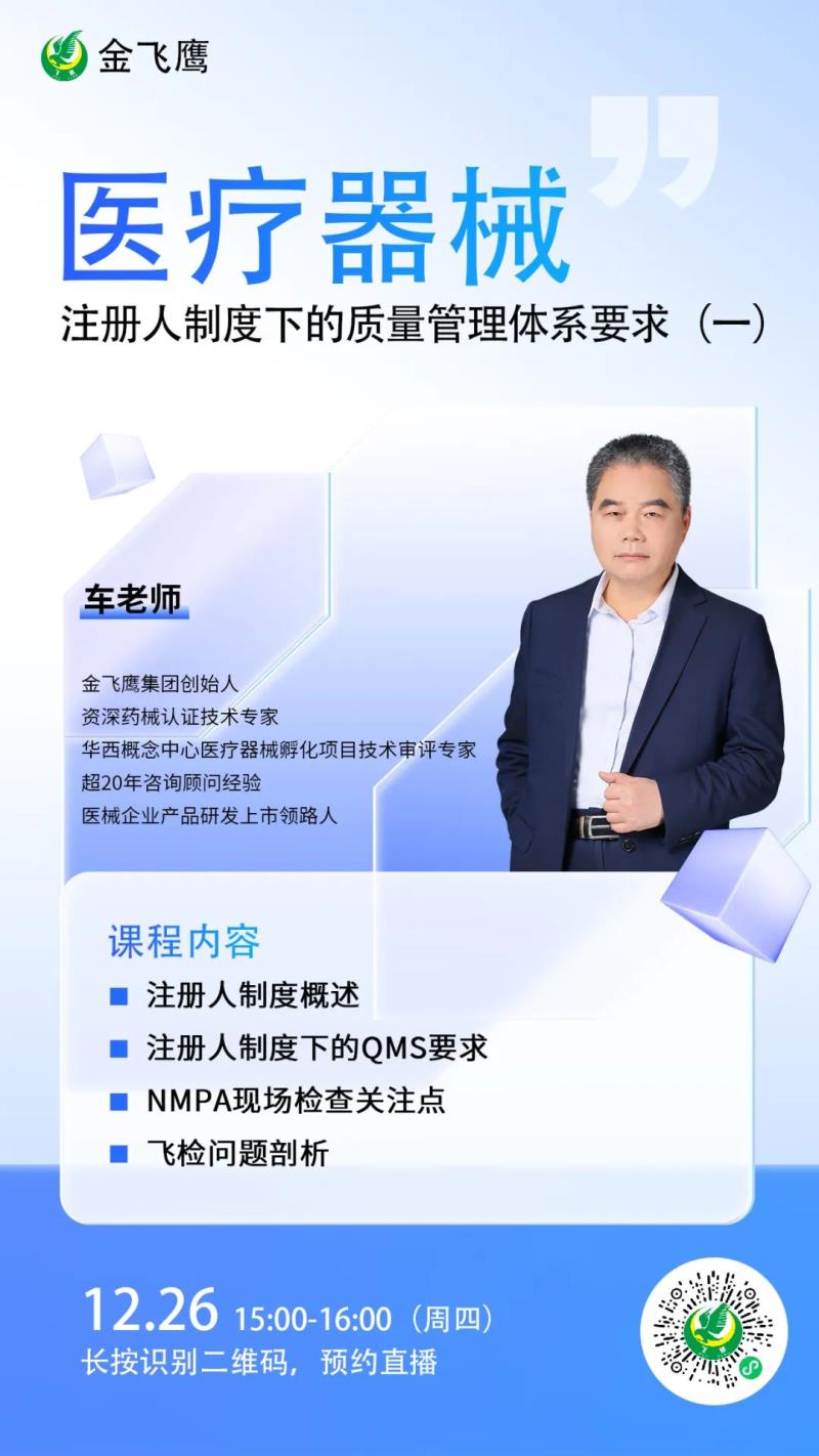 金飛鷹線(xiàn)上直播課【第109期】來(lái)啦又是咱們金飛鷹集團(tuán)創(chuàng)始人車(chē)號(hào)爽老師感興趣的朋友記得識(shí)別上方二維碼預(yù)約《醫(yī)療器械監(jiān)督管理?xiàng)l例》第三十四條明確規(guī)定:“醫(yī)療器械注冊(cè)人、備案人可以自行生產(chǎn)醫(yī)療器械,也可以委托符合本條例規(guī)定、具備相應(yīng)條件的企業(yè)生產(chǎn)醫(yī)療器械?!?/span>這里提到的“委托生產(chǎn)”方式就是業(yè)內(nèi)常說(shuō)的“注冊(cè)人制度”。因?yàn)榇朔N方式涉及注冊(cè)人及生產(chǎn)商兩家企業(yè),國(guó)家對(duì)其監(jiān)管也更為嚴(yán)格,注冊(cè)人在選擇具備相應(yīng)條件的企業(yè)作為受托方后,需與受托方簽訂《醫(yī)療器械委托生產(chǎn)質(zhì)量協(xié)議》,以明確各自在醫(yī)療器械生產(chǎn)過(guò)程中的責(zé)任分工和義務(wù),最終確保醫(yī)械產(chǎn)品的安全有效。但是,通過(guò)近年來(lái)輔導(dǎo)的諸多委托生產(chǎn)案例我們發(fā)現(xiàn),很多醫(yī)療器械注冊(cè)人對(duì)企業(yè)質(zhì)量管理體系的重視不夠,以為委托出去便“萬(wàn)事大吉”了,從而導(dǎo)致在現(xiàn)場(chǎng)檢查中體系不符合規(guī)定、委托方對(duì)受托方的審核監(jiān)管不到位、雙方職責(zé)不明確等問(wèn)題層出不窮,因此我們策劃了本期課程,結(jié)合具體實(shí)例,給大家全面剖析醫(yī)療器械注冊(cè)人制度下的質(zhì)量管理體系要求。12月26日下午3點(diǎn),金飛鷹集團(tuán)創(chuàng)始人車(chē)號(hào)爽老師給大家?guī)?lái)《醫(yī)療器械注冊(cè)人制度下的質(zhì)量管理體系要求》,培訓(xùn)內(nèi)容包括注冊(cè)人制度概述、注冊(cè)人制度下的QMS要求、NMPA現(xiàn)場(chǎng)檢查關(guān)注點(diǎn)、飛檢問(wèn)題剖析,想聽(tīng)課的朋友記得提前預(yù)約!