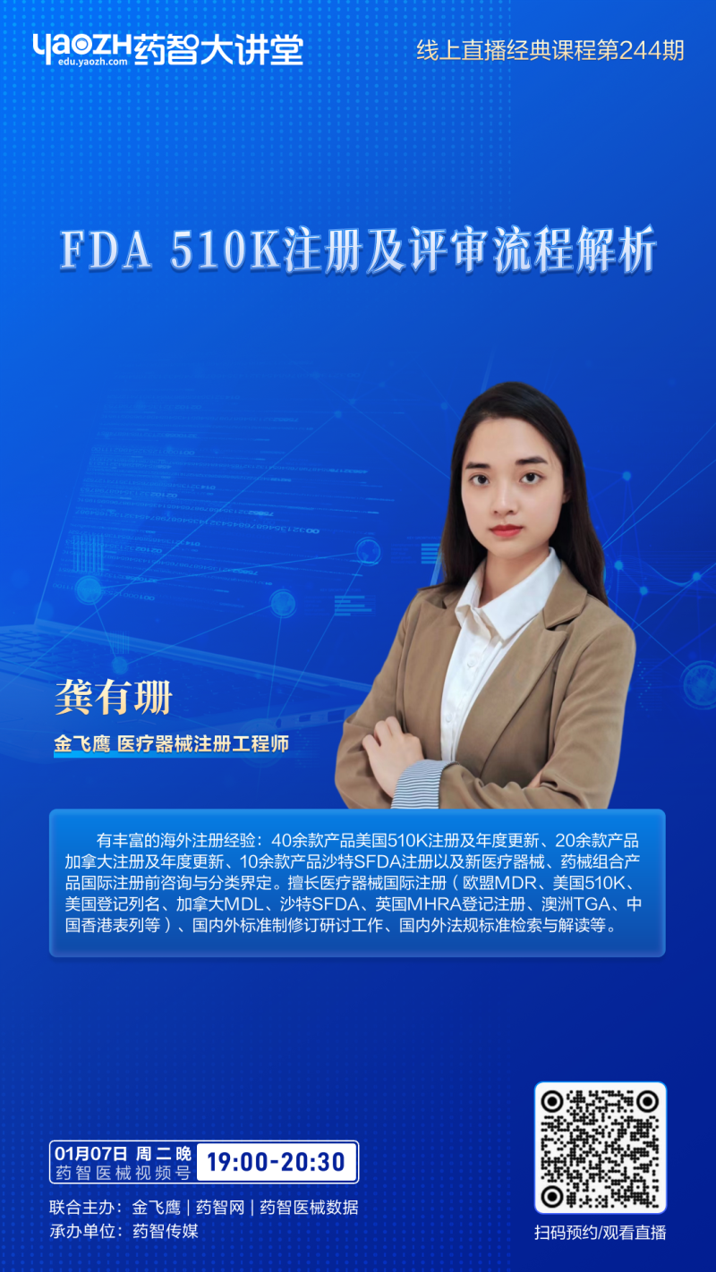 本著與業(yè)內(nèi)各合作機(jī)構(gòu)互通有無的原則,2025年1月7日19:00,我們即將聯(lián)合藥智網(wǎng)、藥智醫(yī)械數(shù)據(jù),給大家?guī)砹艘粓?chǎng)《FDA 510(k)注冊(cè)及評(píng)審流程解析》的線上直播課程分享。