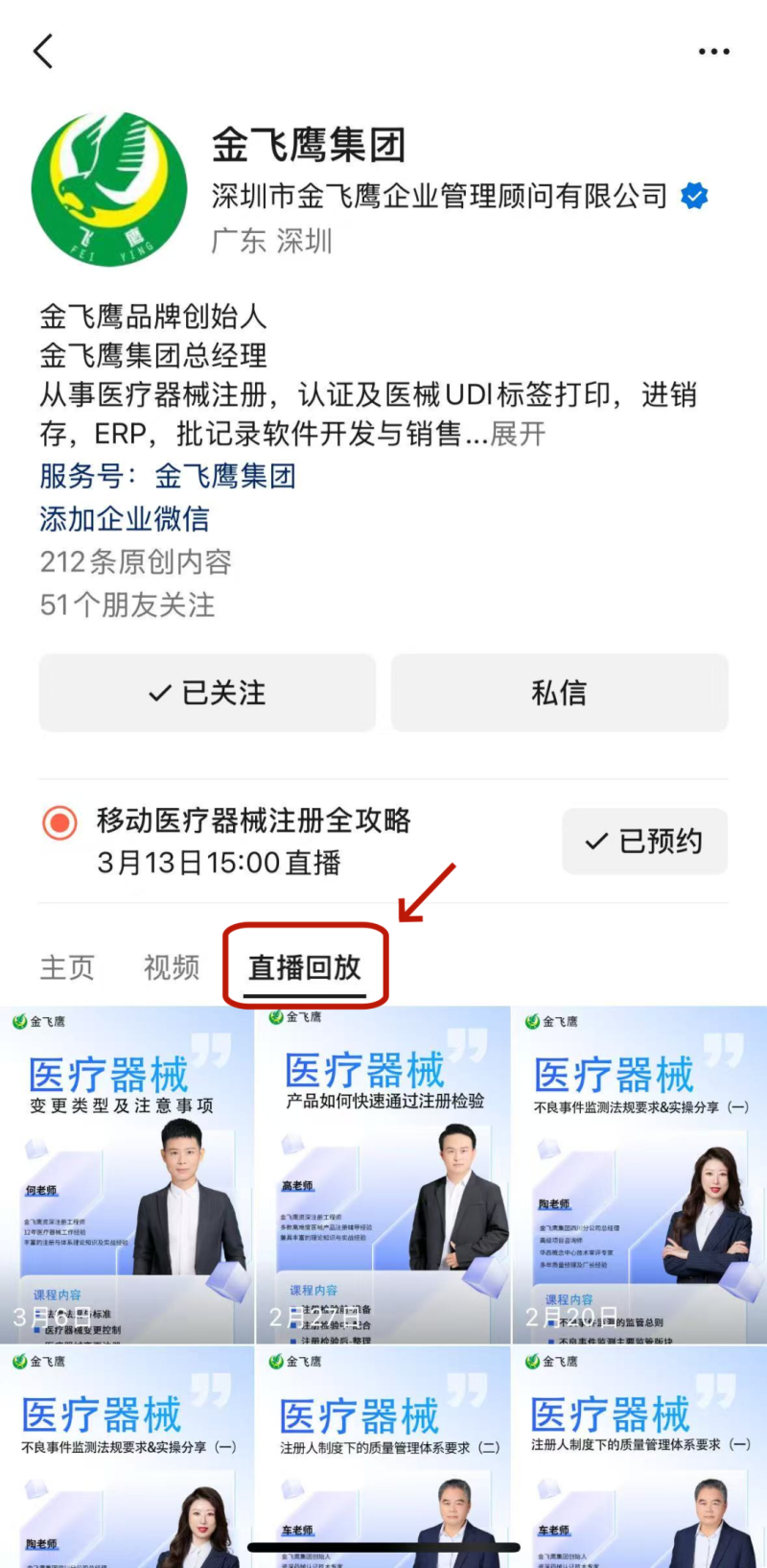 往期直播培訓(xùn)課程支持回放,關(guān)注“金飛鷹藥械咨詢服務(wù)”視頻號并點(diǎn)擊視頻號主頁,即可查看“直播回放”哦~