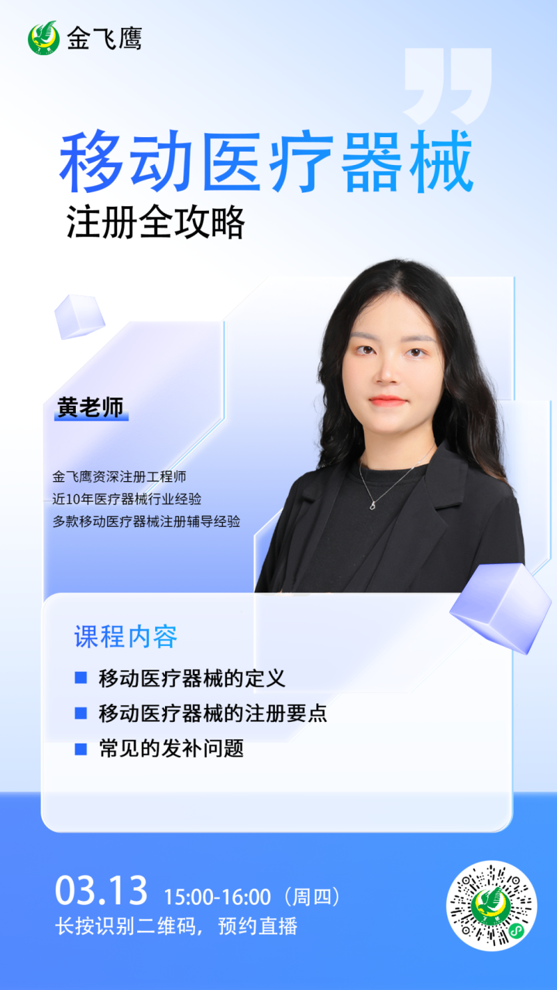 金飛鷹直播培訓(xùn),是每周一次的固定培訓(xùn)欄目,優(yōu)選金飛鷹國內(nèi)外資深注冊/項(xiàng)目老師定期為大家講解醫(yī)療器械注冊相關(guān)知識,解答大家在醫(yī)療器械注冊過程中的諸多疑問。