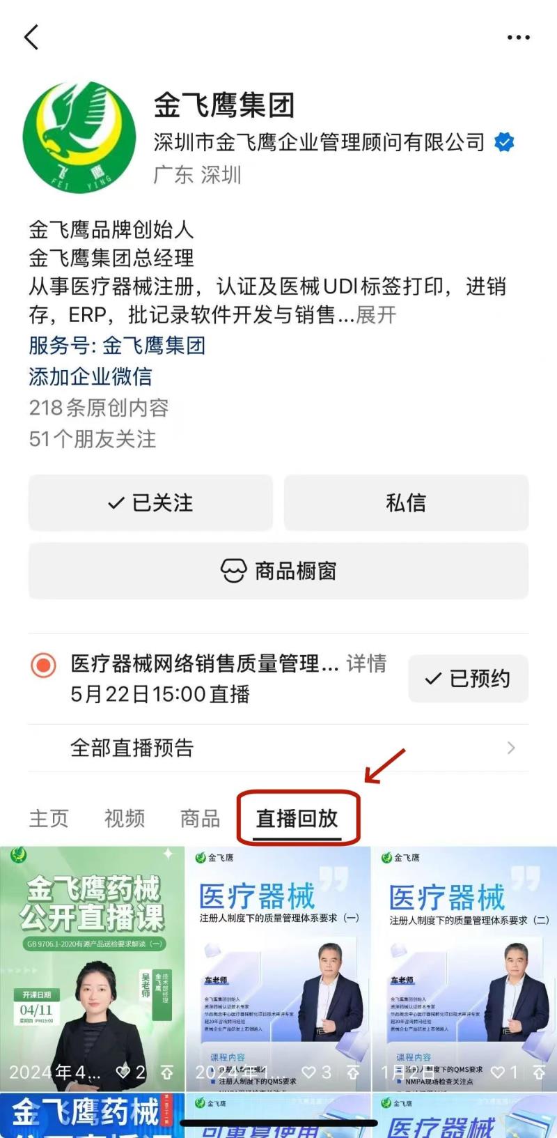 往期直播培訓課程支持回放,關注“金飛鷹藥械咨詢服務”視頻號并點擊視頻號主頁,即可查看“直播回放”哦~
