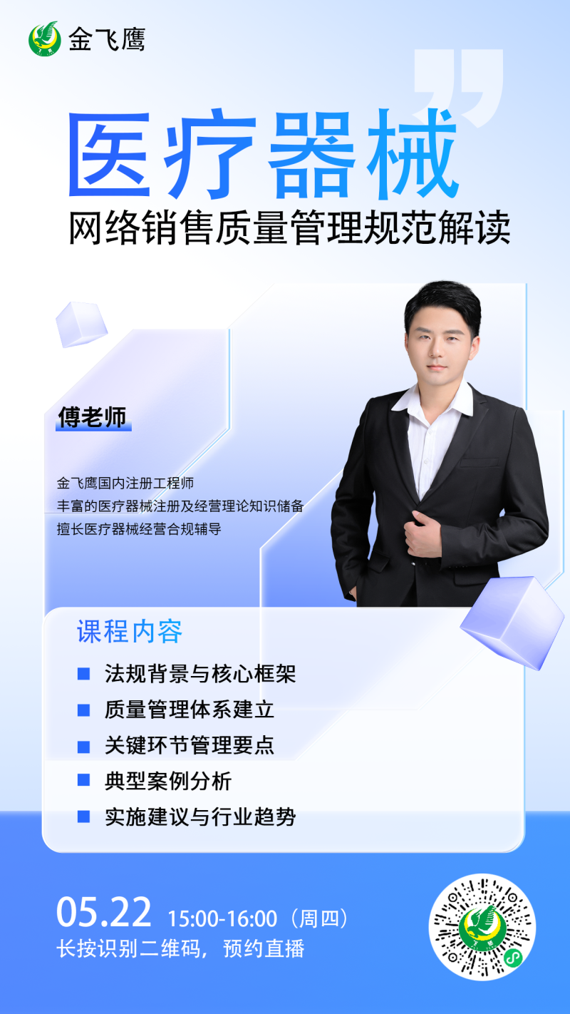 5月22日下午3點,金飛鷹國內注冊工程師、擅長醫(yī)療器械經(jīng)營合規(guī)輔導的傅老師給大家?guī)怼夺t(yī)療器械網(wǎng)絡銷售質量管理規(guī)范解讀》,他將立足醫(yī)療器械網(wǎng)絡銷售監(jiān)管新形勢,系統(tǒng)解讀《規(guī)范》的立法背景與核心要求,幫助企業(yè)準確把握政策要點。同時,傅老師還將重點剖析網(wǎng)絡銷售企業(yè)如何構建符合法規(guī)要求的質量管理體系及關鍵環(huán)節(jié)管理要點,并通過典型案例分析,為企業(yè)規(guī)避經(jīng)營風險提供實用指導。