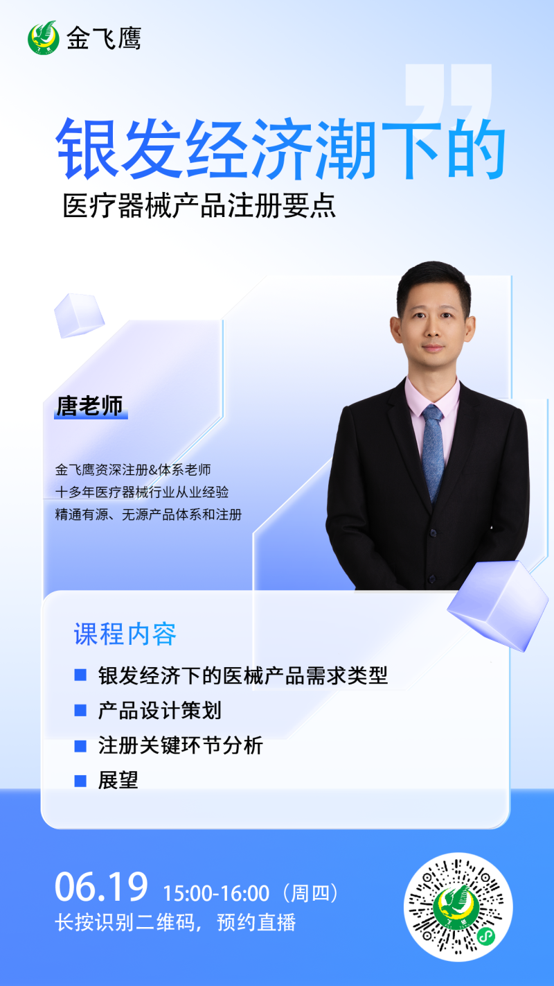 6月19日下午3點,有著十多年醫(yī)療器械行業(yè)從業(yè)經(jīng)驗、精通醫(yī)療器械產(chǎn)品注冊及體系輔導(dǎo)的唐老師給大家?guī)怼?/span>銀發(fā)經(jīng)濟(jì)浪潮下的醫(yī)療器械注冊要點,感興趣的朋友記得提前預(yù)約,與我們一起解鎖“銀發(fā)經(jīng)濟(jì)產(chǎn)品注冊全流程優(yōu)化方案~