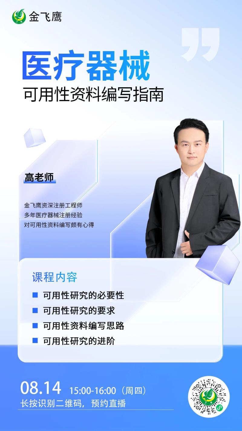 8月14日下午3點(diǎn),金飛鷹資深注冊(cè)工程師,擁有多年醫(yī)療器械行業(yè)經(jīng)驗(yàn),對(duì)可用性資料頗有研究的高老師給大家?guī)怼?/span>醫(yī)療器械可用性資料編寫指南》,他將結(jié)合實(shí)際案例,詳細(xì)拆解可用性研究資料的編寫要素,為企業(yè)提供切實(shí)可行的指導(dǎo)建議感興趣的朋友記得提前預(yù)約!