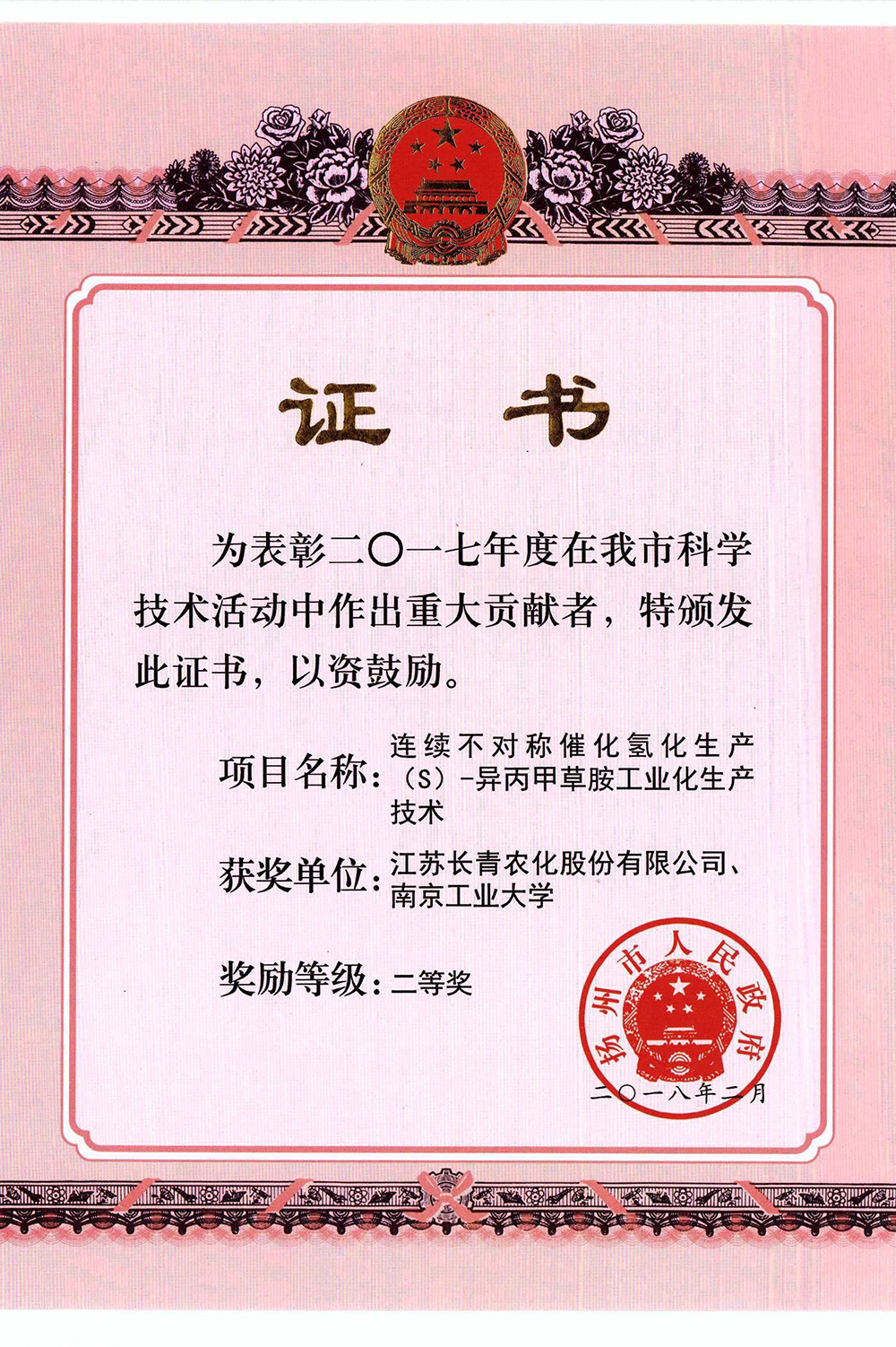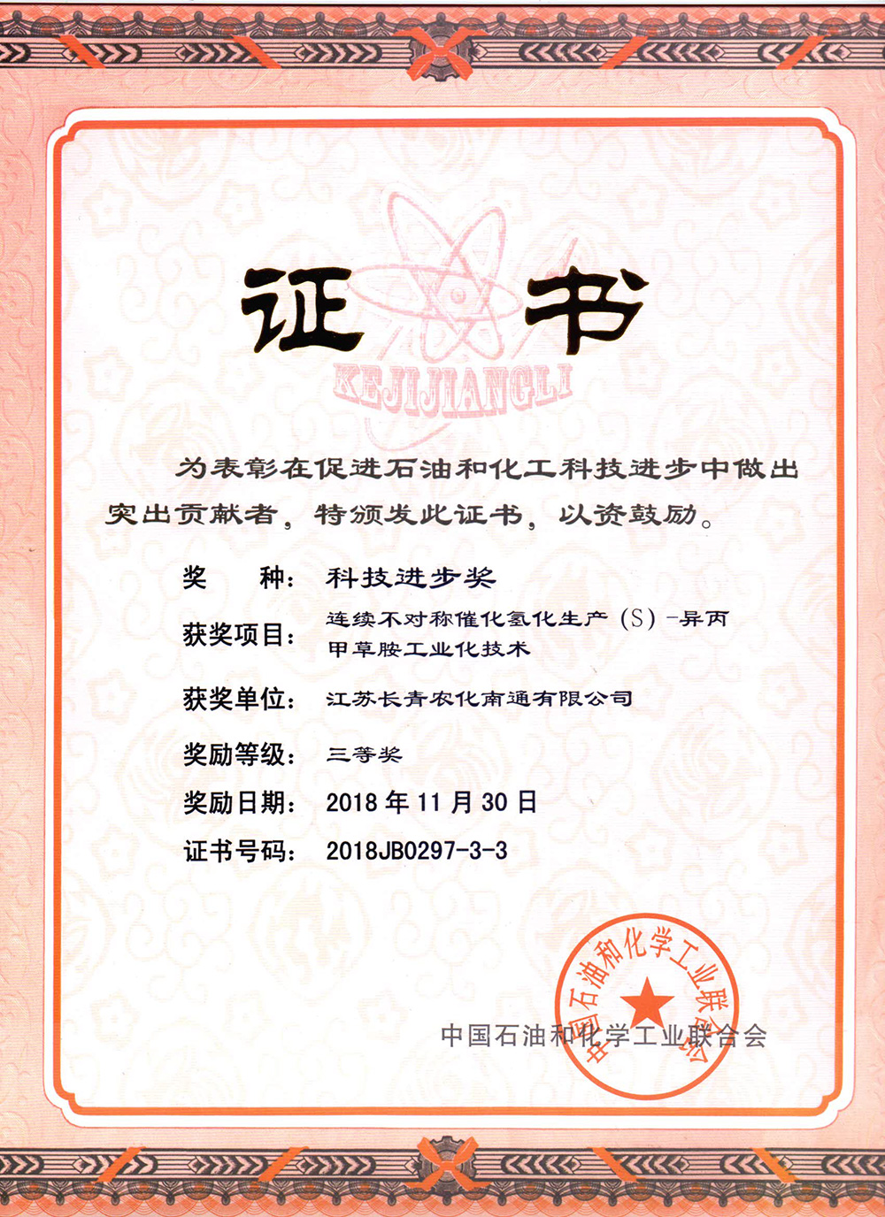 2018中國石油和化學工業科學技術獎勵--證書--長青南通