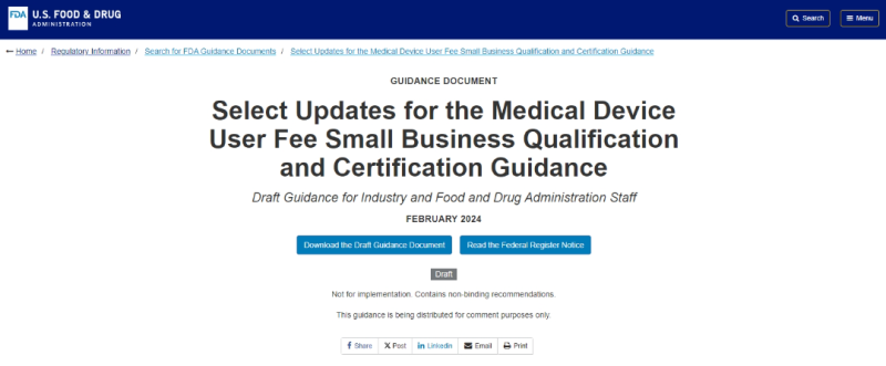 近日,F(xiàn)DA發(fā)布一份指南草案“Select Updates for the Medical Device User Fee Small Business Qualification and Certification Guidance”,提議對(duì)原有《醫(yī)療器械用戶費(fèi)用、小企業(yè)資格和認(rèn)證》指南文件進(jìn)行更新。