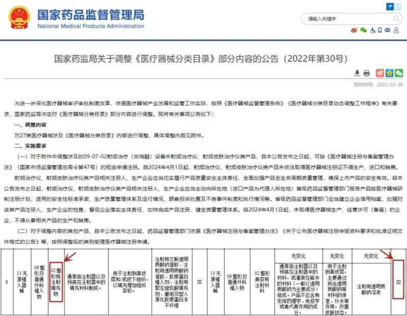 事實(shí)上,我們之前也跟大家科普過(guò),國(guó)家藥監(jiān)局早在2022年3月就發(fā)布了《關(guān)于調(diào)整〈醫(yī)療器械分類(lèi)目錄〉部分內(nèi)容的公告(2022年第30號(hào))》,其中明確提到整形用注射填充物為監(jiān)管級(jí)別最高的第三類(lèi)醫(yī)療器械,需嚴(yán)格按照《醫(yī)療器械注冊(cè)與備案管理辦法》等進(jìn)行醫(yī)療器械注冊(cè)申請(qǐng)。