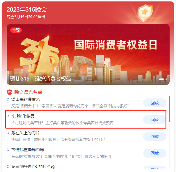相信大家已有所了解,本年度315晚會(huì)被曝光的名單有假香米、美容針、安全頭盔……這其中有一個(gè)我們十分熟悉的產(chǎn)品——美容針。