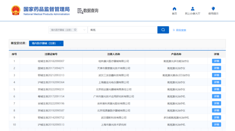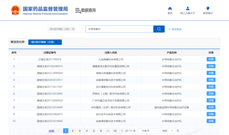 半導(dǎo)體激光器又稱激光二極管,是用半導(dǎo)體材料作為工作物質(zhì)的激光器。常用工作物質(zhì)有砷化鎵、硫化鎘等,激勵(lì)方式有電注入、電子束激勵(lì)和光泵浦三種方式。我們?cè)趪?guó)家藥監(jiān)局境內(nèi)醫(yī)療器械注冊(cè)數(shù)據(jù)庫(kù)中以“半導(dǎo)體激光”進(jìn)行檢索,總計(jì)檢索出100多條產(chǎn)品列表,這些產(chǎn)品根據(jù)其波長(zhǎng)的不同,有著有脫毛、生發(fā)以及高脂血癥輔助治療等多種預(yù)期用途。