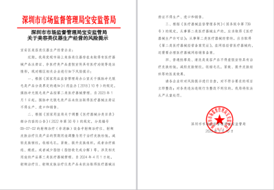 近日,深圳市市場(chǎng)監(jiān)督管理局寶安監(jiān)管局發(fā)布一份關(guān)于美容類儀器生產(chǎn)經(jīng)營(yíng)風(fēng)險(xiǎn)提示的紅頭文件,具體內(nèi)容如下: