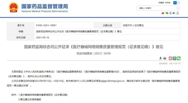 9月18日,國(guó)家藥監(jiān)局官網(wǎng)發(fā)布《醫(yī)療器械網(wǎng)絡(luò)銷(xiāo)售質(zhì)量管理規(guī)范(征求意見(jiàn)稿)》(以下簡(jiǎn)稱《管理規(guī)范》),并向社會(huì)公開(kāi)征求意見(jiàn)。