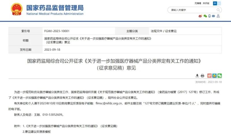 9月18日,國家藥監(jiān)局官網(wǎng)發(fā)布《關(guān)于進(jìn)一步加強(qiáng)醫(yī)療器械產(chǎn)品分類界定有關(guān)工作的通知(征求意見稿)》(以下簡稱《通知》),并向社會公開征求意見。