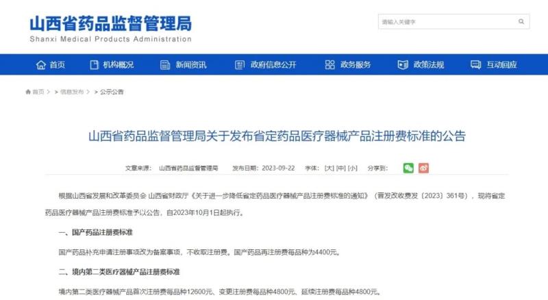 9月22日,山西省藥監(jiān)局官網(wǎng)根據(jù)山西省發(fā)展和改革委員會、山西省財政廳發(fā)布的《關(guān)于進一步降低省定藥品醫(yī)療器械產(chǎn)品注冊費標(biāo)準(zhǔn)的通知》(晉發(fā)改收費發(fā)〔2023〕361號),對省定藥品醫(yī)療器械產(chǎn)品注冊費標(biāo)準(zhǔn)予以公告,自2023年10月1日起執(zhí)行。具體收費標(biāo)準(zhǔn)如下: