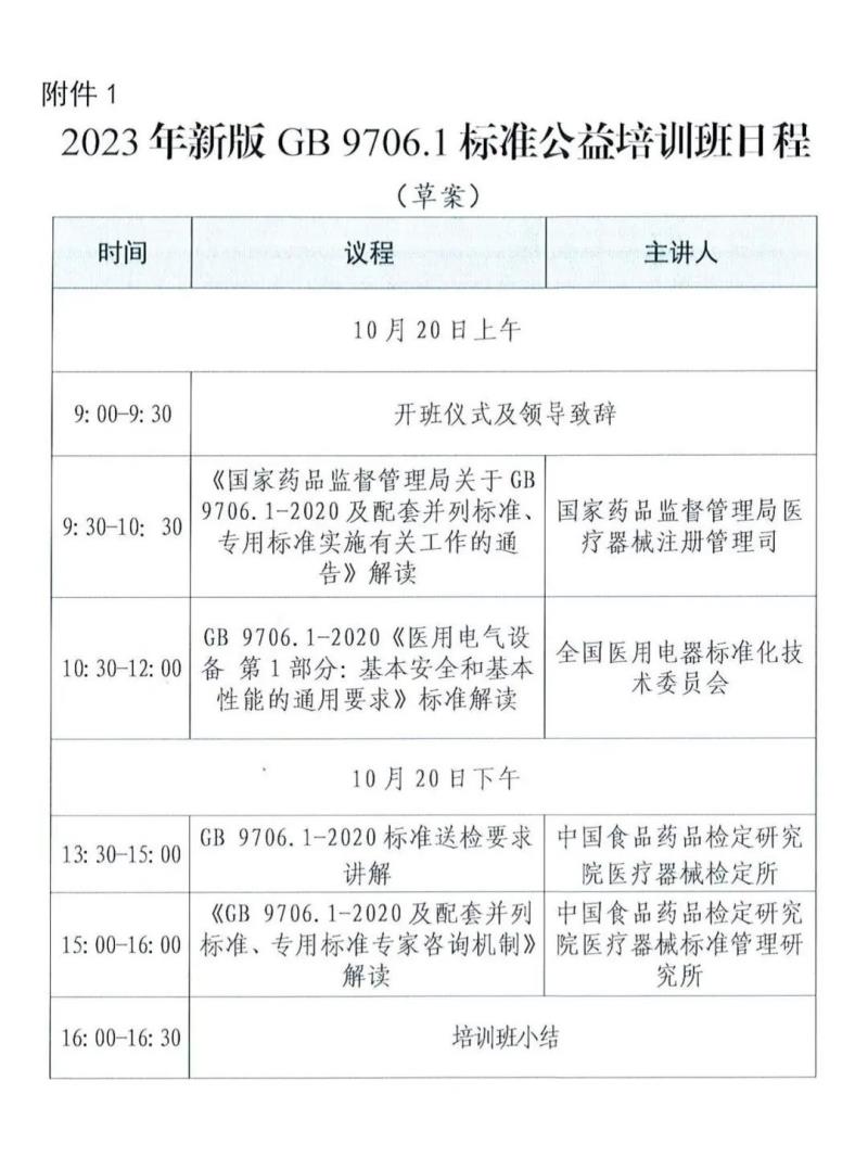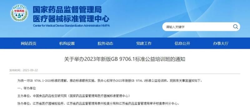 近日,中檢院官網(wǎng)發(fā)布《關(guān)于舉辦2023年新版GB 9706.1標(biāo)準(zhǔn)公益培訓(xùn)班的通知》,擬定于2023年10月20日開(kāi)展新版GB 9706.1標(biāo)準(zhǔn)培訓(xùn),相關(guān)事宜具體如下: