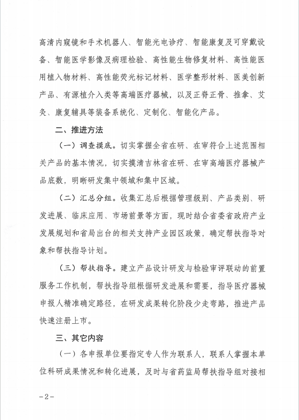 其中提到,產(chǎn)品范圍包括“吉林省在研、在審的第二類(lèi)和第三類(lèi)高端醫(yī)療器械產(chǎn)品,特別是智能分子診斷、生化與免疫臨床檢驗(yàn)、即時(shí)檢驗(yàn)檢測(cè)、智能高清內(nèi)窺鏡和手術(shù)機(jī)器人、智能光電診療、智能康復(fù)及可穿戴設(shè)備、智能醫(yī)學(xué)影像及病理檢驗(yàn)、高性能生物修復(fù)材料、高性能醫(yī)用植入物材料、高性能熒光標(biāo)記材料、醫(yī)學(xué)整形材料、醫(yī)美創(chuàng)新產(chǎn)品、有源植介入類(lèi)等高端醫(yī)療器械,以及正脊正骨、推拿、艾灸、康復(fù)輔具等裝備系統(tǒng)化、定制化、智能化產(chǎn)品。”