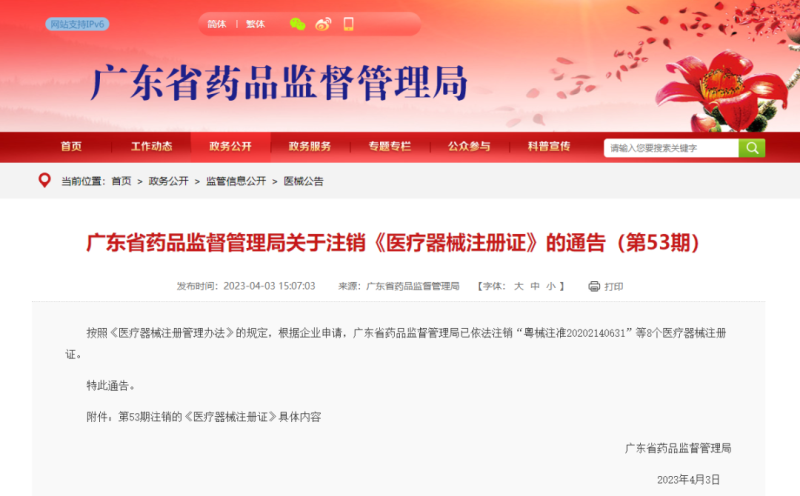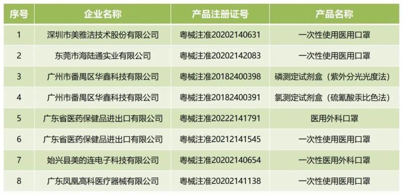 近日,廣東省藥監(jiān)局官網(wǎng)發(fā)布通告稱,按照《醫(yī)療器械注冊管理辦法》的規(guī)定,根據(jù)企業(yè)申請,廣東省藥品監(jiān)督管理局已依法注銷“粵械注準(zhǔn)20202140631”等8個(gè)醫(yī)療器械注冊證,其中包括一次性使用醫(yī)用口罩、磷測定試劑盒(紫外分光光度法)等產(chǎn)品,具體明細(xì)如下: