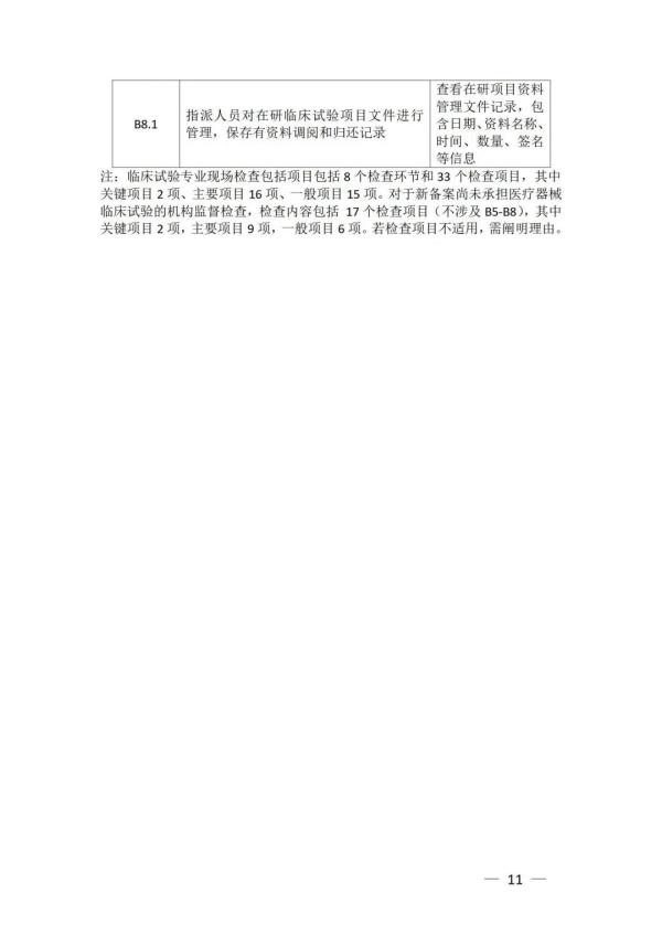 《檢查要點》指出,檢查內(nèi)容分為機構和臨床試驗專業(yè)兩部分,包括17個檢查環(huán)節(jié)、78個檢查項目,包括對條件與備案管理、運行情況等方面的現(xiàn)場檢查內(nèi)容。檢查項目中關鍵項目共計8項(標示為“★★”),主要項目共計34項(標示為“★”),一般項目共計36項。其中8項關鍵項目具體如下: