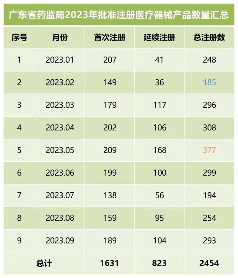 我們同步匯總了2023年各個(gè)月份廣東省藥監(jiān)局批準(zhǔn)注冊(cè)的醫(yī)療器械產(chǎn)品數(shù)量(見下方表格),從表格中可以看出,截至9月底,2023年廣東藥監(jiān)局總計(jì)批準(zhǔn)注冊(cè)第二類醫(yī)療器械產(chǎn)品2454個(gè),其中首次注冊(cè)1631個(gè),延續(xù)注冊(cè)823個(gè)。