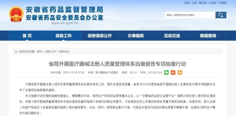 該局指出,本次抽查行動在隨機抽查的基礎(chǔ)上,兼顧集采中選、委托生產(chǎn)和四級監(jiān)管等重點企業(yè),從“安徽省藥品綜合監(jiān)管平臺”抽取30家注冊人報送的自查報告,依據(jù)《醫(yī)療器械質(zhì)量管理體系年度自查報告編寫指南》(以下簡稱《編寫指南》)和相關(guān)政策法規(guī)要求,對自查報告的上傳情況和報告質(zhì)量開展系統(tǒng)核查。經(jīng)查發(fā)現(xiàn),部分注冊人未能嚴(yán)格落實《編寫指南》相關(guān)填報要求,主動、按時、按質(zhì)報告意識不強,對報告中相關(guān)內(nèi)容的政策法規(guī)要求模糊不清,在委托/受托生產(chǎn)事項方面問題較多。
