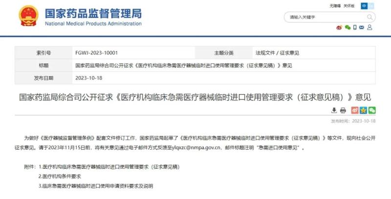 10月18日,國家藥監(jiān)局官網(wǎng)發(fā)布《醫(yī)療機(jī)構(gòu)臨床急需醫(yī)療器械臨時進(jìn)口使用管理要求(征求意見稿)》(以下簡稱《管理要求》),并向社會公開征求意見。