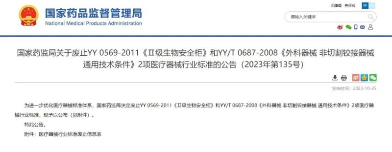 10月25日,國家藥監(jiān)局官網(wǎng)發(fā)布公告稱,廢止YY 0569-2011《Ⅱ級生物安全柜》和YY/T 0687-2008《外科器械 非切割鉸接器械 通用技術(shù)條件》2項(xiàng)醫(yī)療器械行業(yè)標(biāo)準(zhǔn),除附件中公布的廢止日期外,我們同步整理了此兩項(xiàng)標(biāo)準(zhǔn)廢止后的替代標(biāo)準(zhǔn),具體如下: