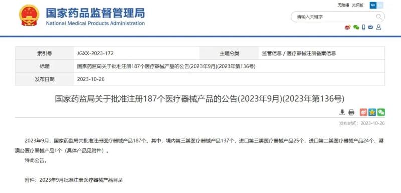 10月26日,國(guó)家藥監(jiān)局官網(wǎng)發(fā)布公告稱,2023年9月,國(guó)家藥監(jiān)局共批準(zhǔn)注冊(cè)醫(yī)療器械產(chǎn)品187個(gè)。其中,境內(nèi)第三類醫(yī)療器械產(chǎn)品137個(gè),進(jìn)口第三類醫(yī)療器械產(chǎn)品25個(gè),進(jìn)口第二類醫(yī)療器械產(chǎn)品24個(gè),港澳臺(tái)醫(yī)療器械產(chǎn)品1個(gè)。