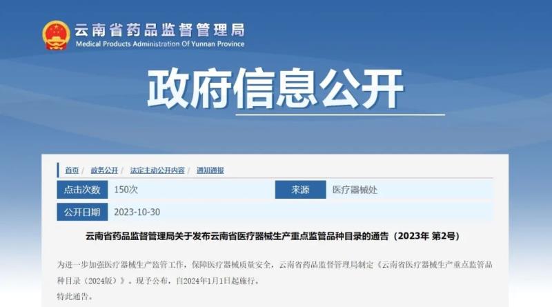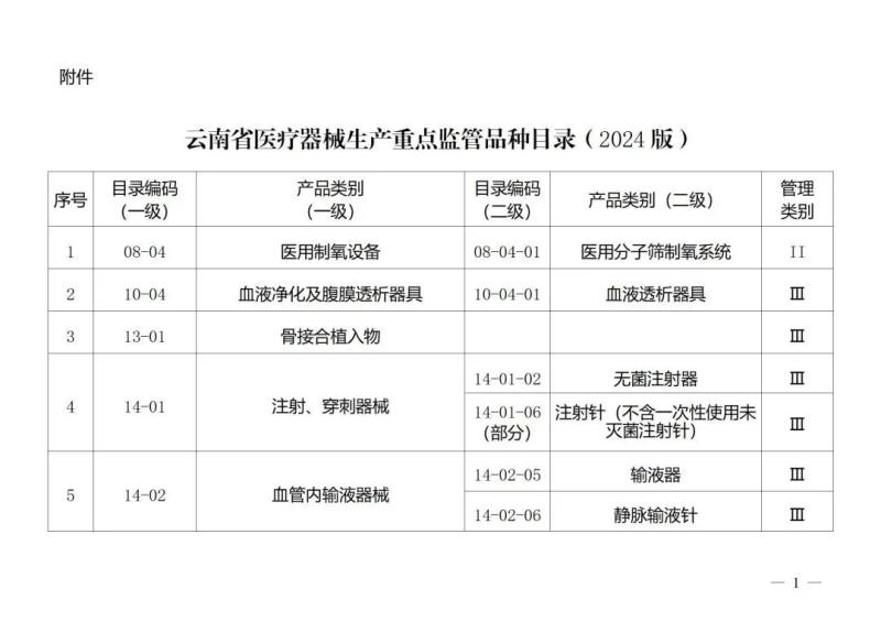 10月30日,云南省藥監(jiān)局官網(wǎng)公布《云南省醫(yī)療器械生產(chǎn)重點監(jiān)管品種目錄(2024版)》(以下簡稱《目錄》),其中包括醫(yī)用分子篩制氧系統(tǒng)、創(chuàng)面敷貼等7種Ⅱ類產(chǎn)品及血液透析器具、無菌注射器等9種Ⅲ類產(chǎn)品?!赌夸洝?strong style="margin: 0px; padding: 0px; outline: 0px; max-width: 100%; box-sizing: border-box !important; overflow-wrap: break-word !important; visibility: visible;">自2024年1月1日起施行,以下為具體清單: