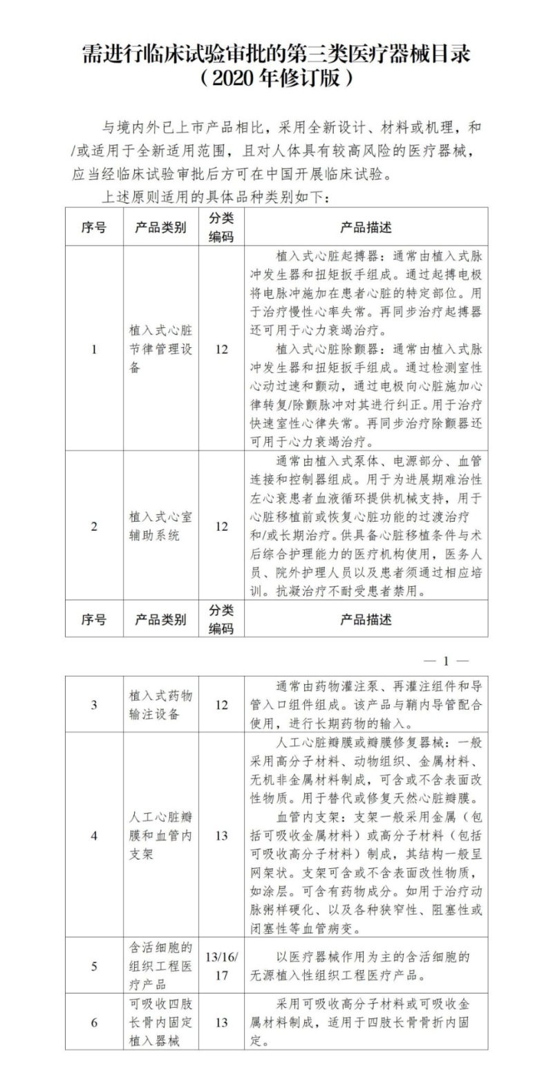 那么目前有哪些醫(yī)療器械產(chǎn)品需進行臨床試驗審批呢?根據(jù)《國家藥監(jiān)局關于發(fā)布需進行臨床試驗審批的第三類醫(yī)療器械目錄(2020年修訂版)的通告(2020年第61號)》,需進行臨床試驗審批的第三類醫(yī)療器械產(chǎn)品具體如下: