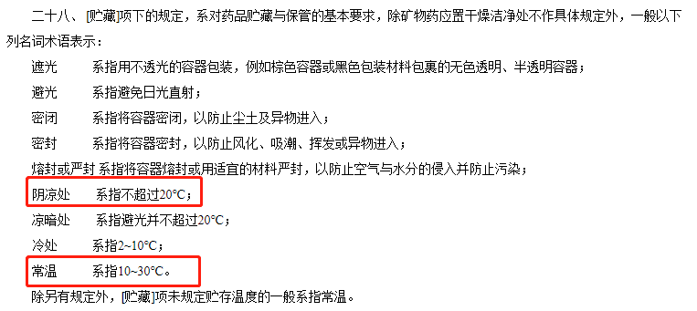 根據(jù)國家藥監(jiān)局食品藥品審核查驗(yàn)中心的回復(fù),參照《中國藥典》(2020年版)第一部“凡例”中內(nèi)容:“陰涼處系指不超過20℃”、“常溫系指10~30℃”,建議企業(yè)可根據(jù)自身產(chǎn)品存儲溫度要求借鑒參考。