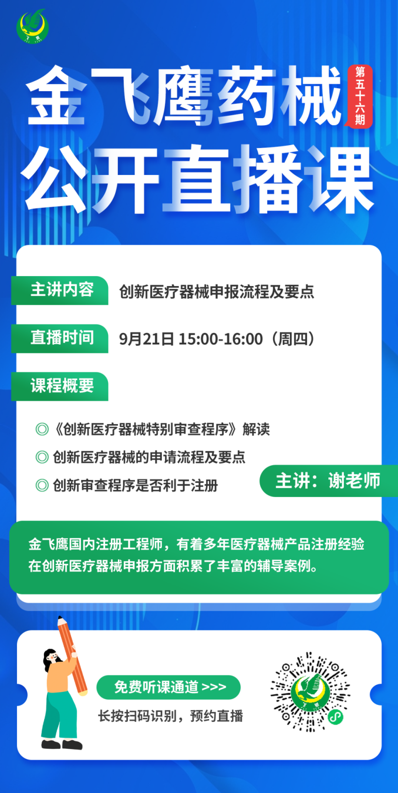 9月21日下午3點,金飛鷹國內(nèi)注冊工程師,有著多年醫(yī)療器械產(chǎn)品注冊經(jīng)驗,在創(chuàng)新醫(yī)療器械申報方面積累了豐富輔導案例的謝老師,給大家?guī)怼秳?chuàng)新醫(yī)療器械申報流程及要點》,培訓內(nèi)容包括《創(chuàng)新醫(yī)療器械特別審查程序》解讀、創(chuàng)新醫(yī)療器械的申請流程及要點、創(chuàng)新審查程序是否利于注冊等,大家千萬不要錯過了哦!