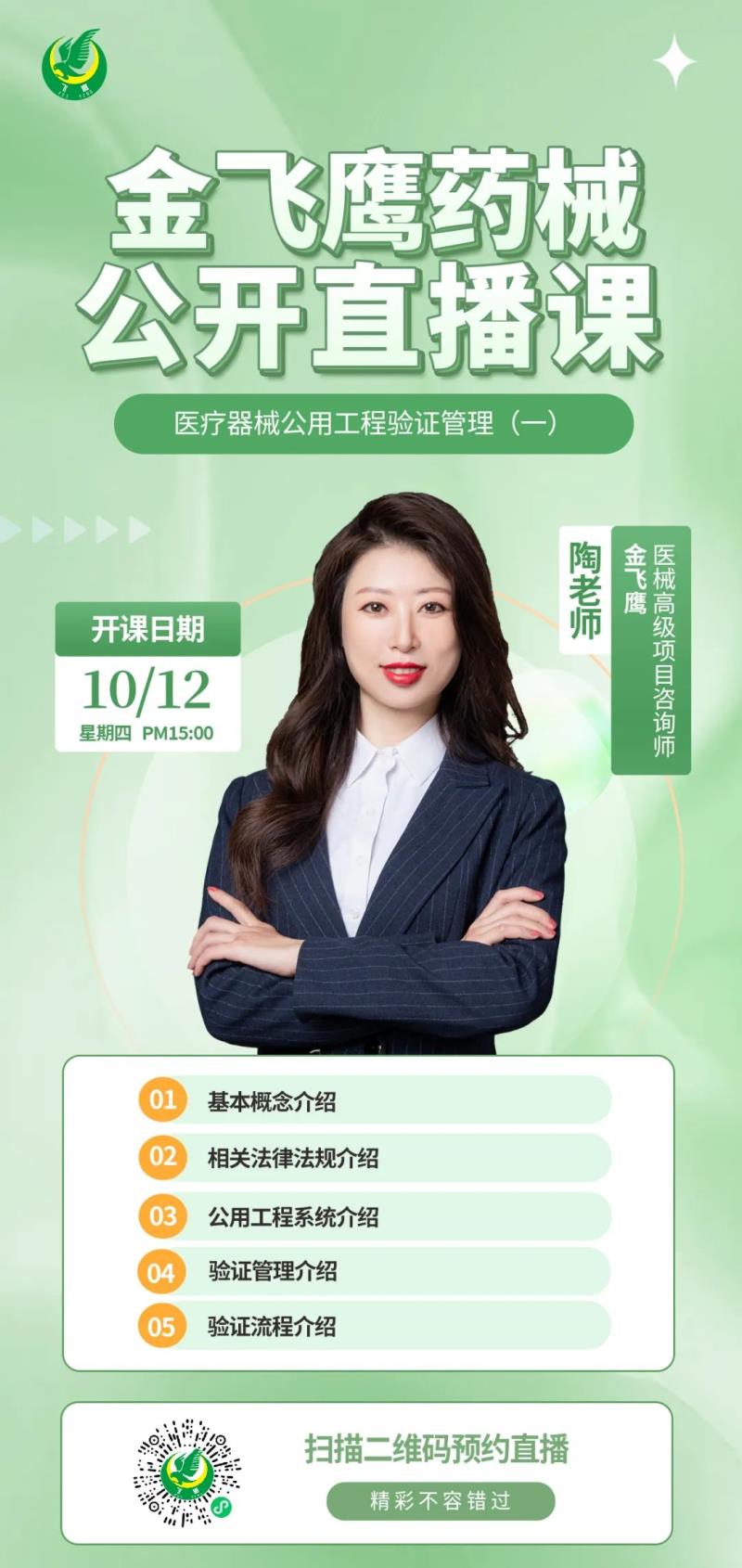 10月12日下午3點(diǎn),金飛鷹高級(jí)項(xiàng)目咨詢師,有著15年工廠管理、7年質(zhì)量經(jīng)理及廠長(zhǎng)經(jīng)驗(yàn),曾主導(dǎo)多個(gè)Ⅱ類&Ⅲ類醫(yī)療器械廠房項(xiàng)目建設(shè)的陶老師,給大家?guī)怼夺t(yī)療器械公用工程驗(yàn)證管理(一)》,培訓(xùn)內(nèi)容包基本概念介紹、相關(guān)法律法規(guī)介紹、公用工程系統(tǒng)介紹、驗(yàn)證管理介紹、驗(yàn)證流程介紹等,大家千萬不要錯(cuò)過了哦