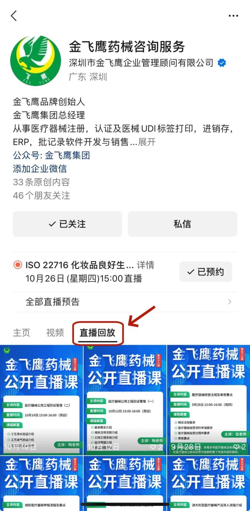 往期直播培訓(xùn)課程支持回放,關(guān)注“金飛鷹藥械咨詢服務(wù)”視頻號(hào)并點(diǎn)擊視頻號(hào)主頁(yè),即可查看“直播回放”哦~