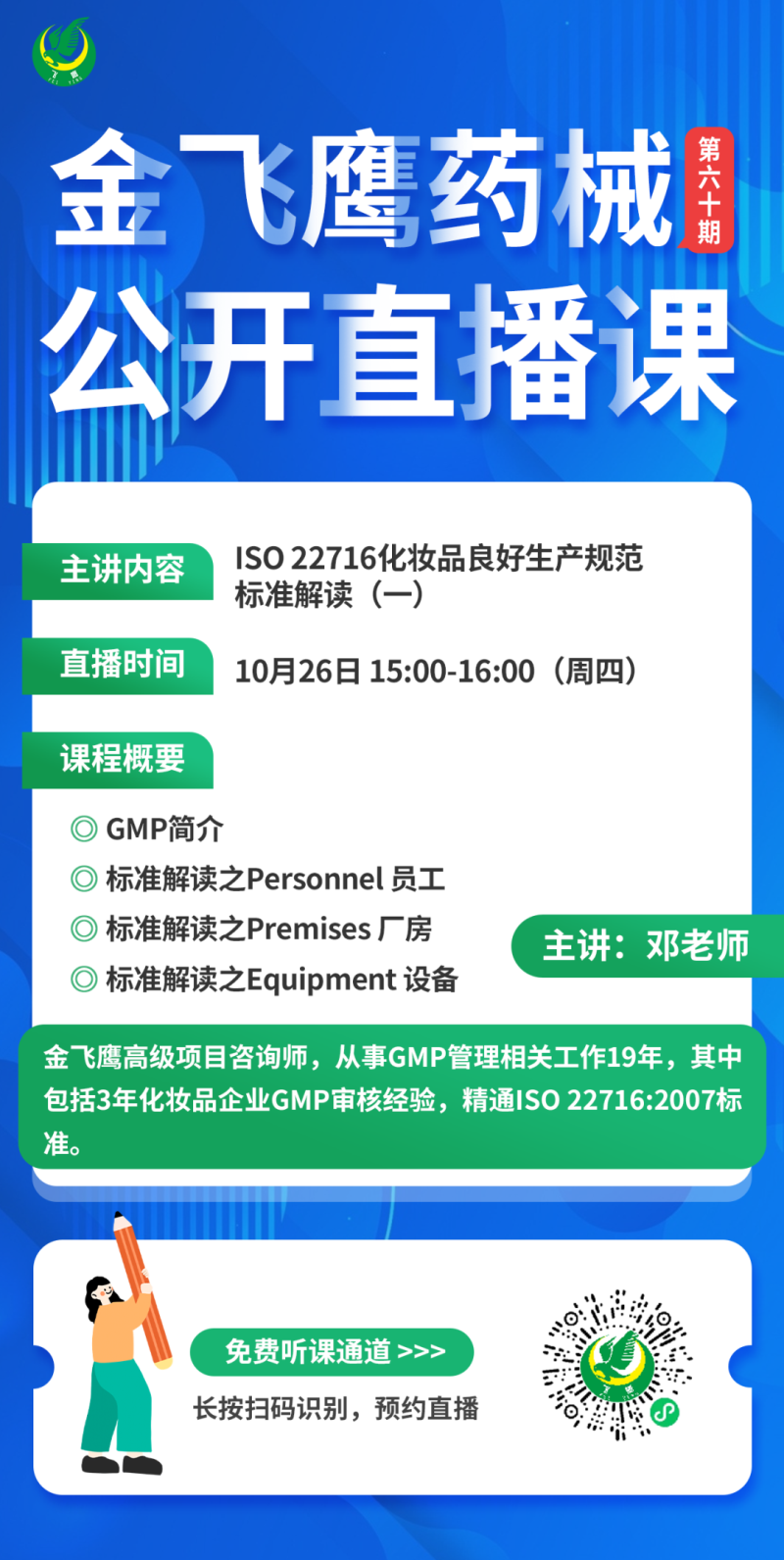 10月26日下午3點(diǎn),金飛鷹高級(jí)項(xiàng)目咨詢師,從事GMP管理相關(guān)工作19年,其中包括3年化妝品企業(yè)GMP審核經(jīng)驗(yàn)的鄧?yán)蠋煟?/span>給大家?guī)?lái)《ISO 22716化妝品良好生產(chǎn)規(guī)范標(biāo)準(zhǔn)解讀(一)》,培訓(xùn)內(nèi)容包括GMP簡(jiǎn)介、標(biāo)準(zhǔn)解讀(員工、廠房及設(shè)備),大家千萬(wàn)不要錯(cuò)過(guò)了哦!