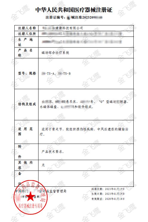 前些天我們跟大家分享了穴位磁療貼的成功案例,接上期內(nèi)容,今天的主角依然是磁療,產(chǎn)品則是更為復(fù)雜的磁場(chǎng)綜合治療系統(tǒng)。前段時(shí)間,金飛鷹輔導(dǎo)一家企業(yè)成功取得了磁場(chǎng)綜合治療系統(tǒng)的注冊(cè)證,如下圖?