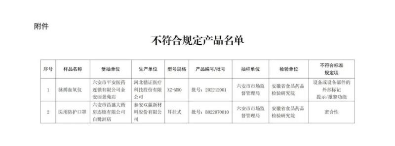 (一)脈搏血氧儀1批:標(biāo)示為河北循證醫(yī)療科技股份有限公司生產(chǎn),設(shè)備或設(shè)備部件的外部標(biāo)記 提示/報(bào)警功能不符合標(biāo)準(zhǔn)規(guī)定。 (二)醫(yī)用防護(hù)口罩1批:標(biāo)示為泰安雙贏新材料股份有限公司生產(chǎn),密合性不符合標(biāo)準(zhǔn)規(guī)定。