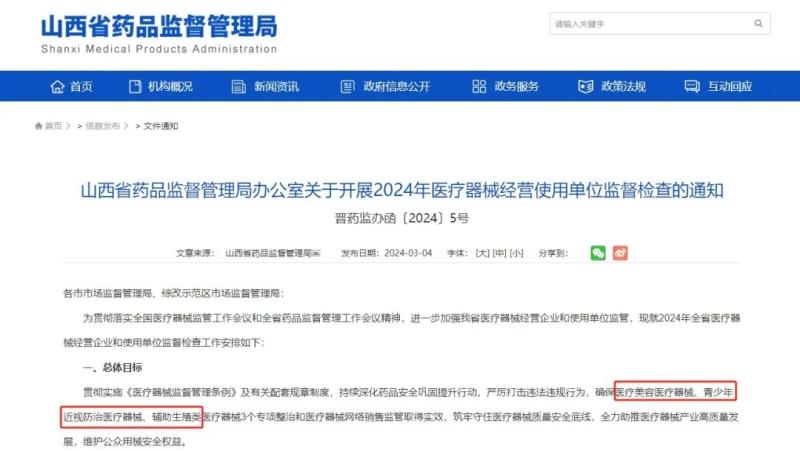 2024年醫(yī)械大檢查在各地逐步推進,3月4日,山西省藥監(jiān)局發(fā)布《關(guān)于開展2024年醫(yī)療器械經(jīng)營使用單位監(jiān)督檢查的通知》,醫(yī)療美容、輔助生殖、青少年近視防治、無菌和植入等領(lǐng)域的相關(guān)醫(yī)療器械為檢查的重點品種。