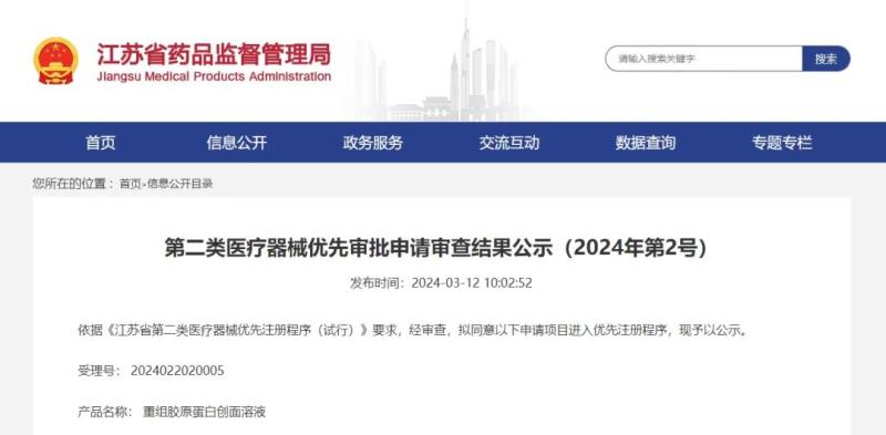 3月12日,江蘇省藥監(jiān)局公示了一期第二類(lèi)醫(yī)療器械優(yōu)先審批申請(qǐng)審查結(jié)果,公示內(nèi)容顯示,這是兩款重組膠原蛋白產(chǎn)品(重組膠原蛋白創(chuàng)面溶液&重組膠原蛋白凍干纖維),申請(qǐng)人均為南京天縱易康生物科技股份有限公司,優(yōu)先審批理由如下:該產(chǎn)品符合《江蘇省第二類(lèi)醫(yī)療器械優(yōu)先注冊(cè)程序(試行)》第四條中第(三)項(xiàng)規(guī)定的要求,即“列入國(guó)家或省部級(jí)科技重大專(zhuān)項(xiàng)、省部級(jí)重點(diǎn)研發(fā)計(jì)劃的醫(yī)療器械”,適用優(yōu)先注冊(cè)程序。