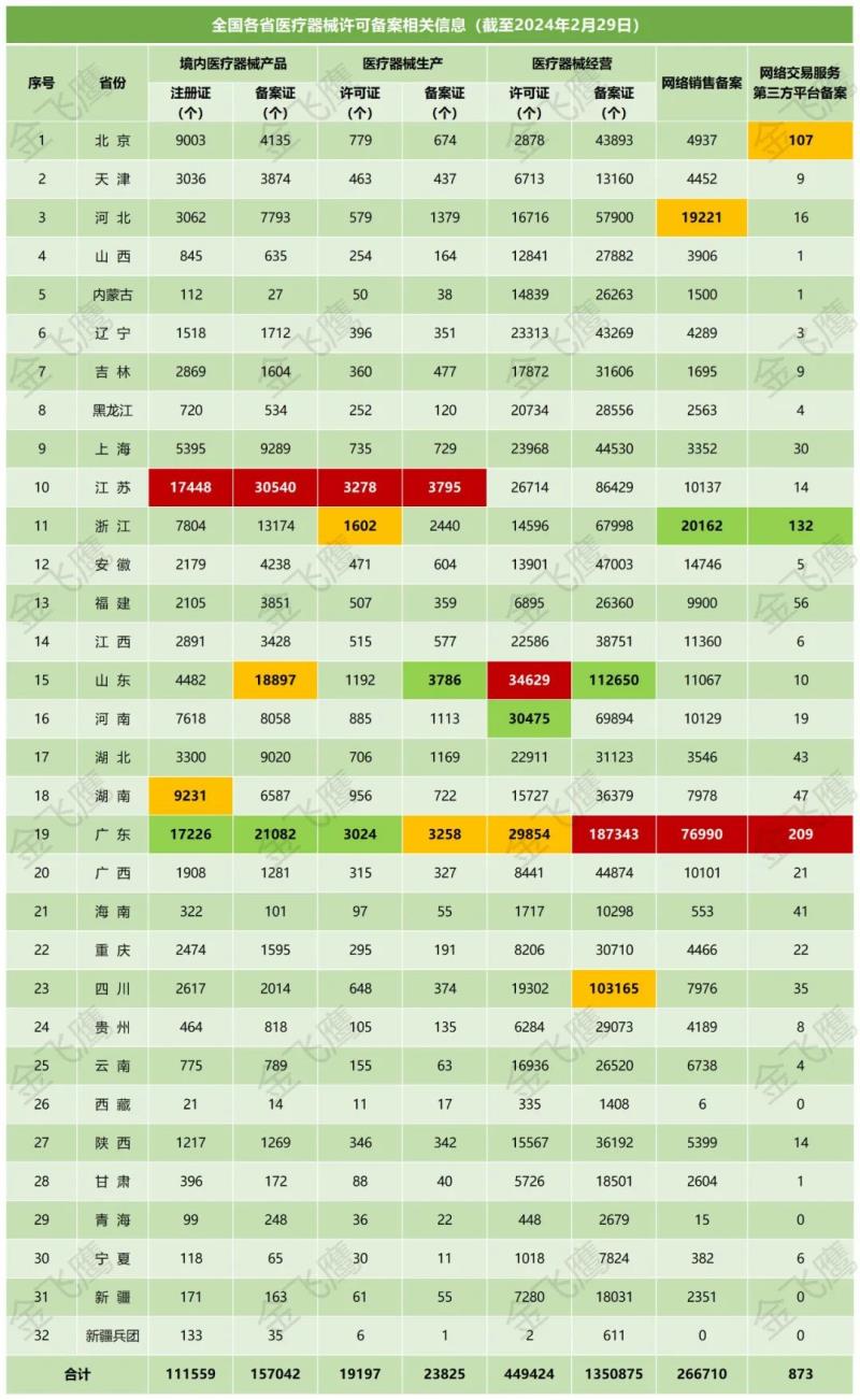 3月12日,國(guó)家藥監(jiān)局公布了截至2024年2月29日各省有效期內(nèi)醫(yī)療器械產(chǎn)品注冊(cè)備案、醫(yī)療器械生產(chǎn)企業(yè)許可備案等信息,老規(guī)矩,金飛鷹小編對(duì)此稍作編輯,標(biāo)注紅色、綠色、黃色的分別為前三甲。